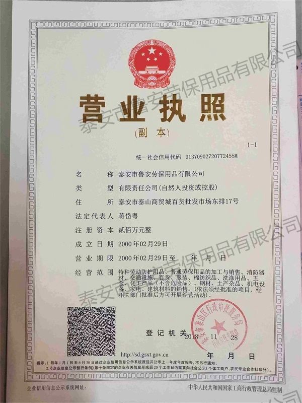泰安市魯安勞保用品有限公司是一家從事勞保用品、勞保用品批發的企業,同年,經主管安全生產的有關部門批準同意,經營銷售特種勞動防護用品